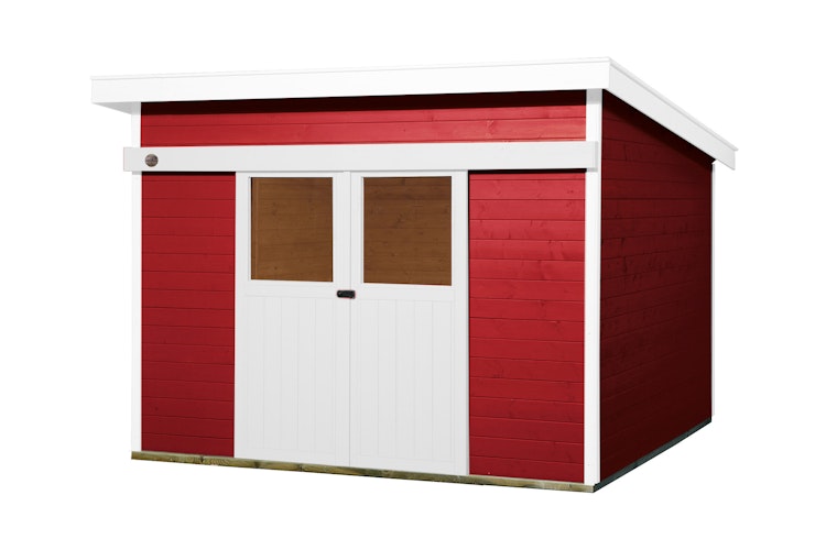 Hochwertiges Weka 21 mm Schiebetürhaus 225 mit attraktivem Pultdach und praktischer Doppel-Schiebetür. Das Gartenhaus ist Teil der vielfältigen Weka Stockton Serie.