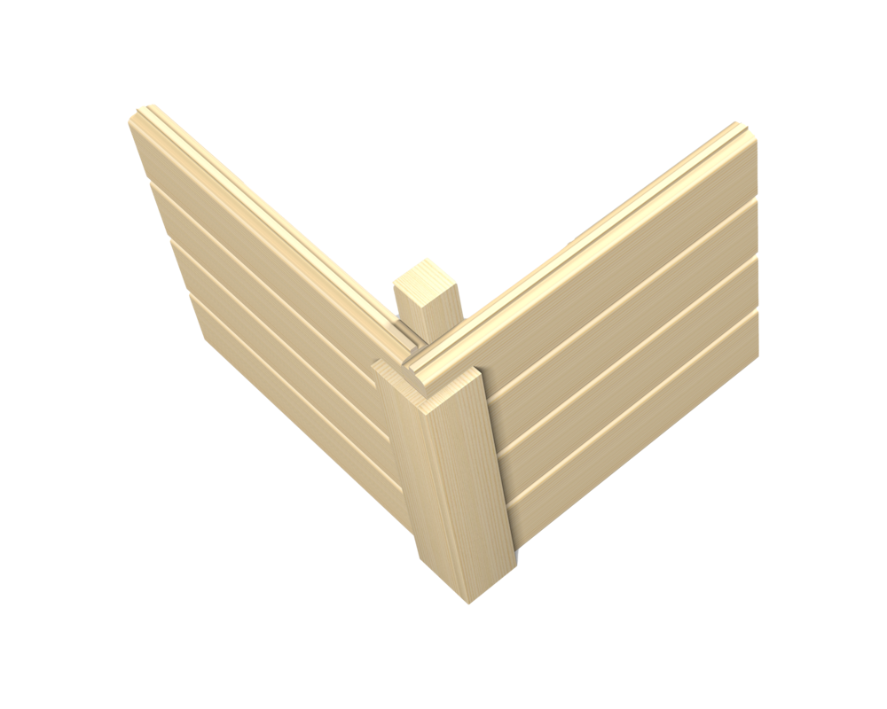 Aus hochwertigem Massivholz und unter strenger Qualitätskontrolle entsteht eine moderne Eckverbindung, die höchsten Anforderungen an Stabilität und Langlebigkeit gerecht wird. Die Wandbohlen werden über Eck mit einem robusten Eckpfosten verschraubt, was für zusätzliche Festigkeit sorgt. Außen angebrachte Deckleisten schützen die Stirnkanten zuverlässig vor Witterungseinflüssen und verleihen dem Gesamtbild eine ansprechende, saubere Optik.