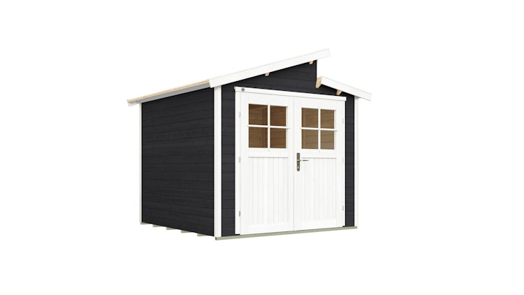 Farbiger Akzent für Ihren Garten: Weka 21 mm Gartenhaus 226 mit versetztem Satteldach, Oberlichtern und praktischer Doppeltür. Das Gartenhaus ist Teil der vielfältigen Weka Blackmount Serie.