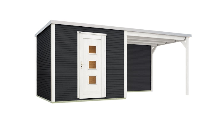 Schickes Flachdach Design-Gartenhaus 413 B inkl. 300 cm Anbau mit Rückwand, elegantem Bohlenprofil, 45 mm Wandstärke und hochwertiger, selbstklebender Dachbahn mit Aluminiumabschlussprofilen sowie einer besonders hohen Eingangstüre (195 cm lichtes Maß). Extravagant und nützlich zugleich! Das Gartenhaus ist Teil der vielfältigen Weka Wekaline Granby Serie.