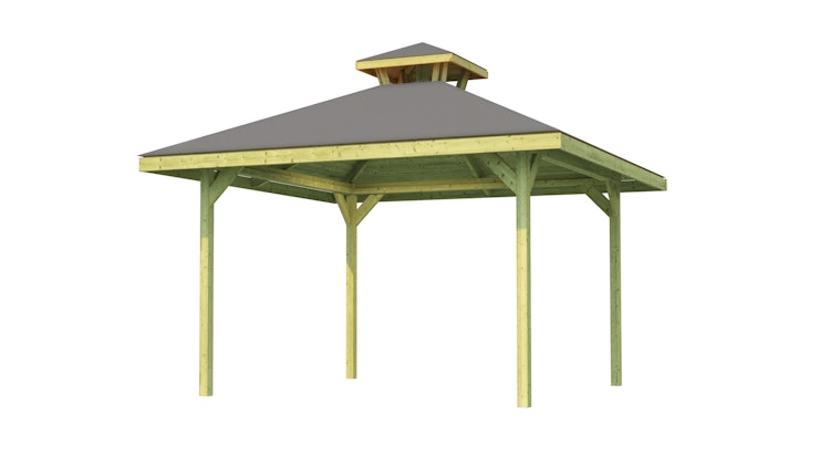 Weka Gartenoase 651 mit Dachaufsatz. Dieses schicke Pavillon kommt mit 19 mm Massivholzdach, Dachaufsatz und 90 x 90 mm Pfosten Die Gartenlaube kann individuell erweitert werden (Wandelemente, Tresen, Sitzbänke) und wird somit zum Alleskönner!