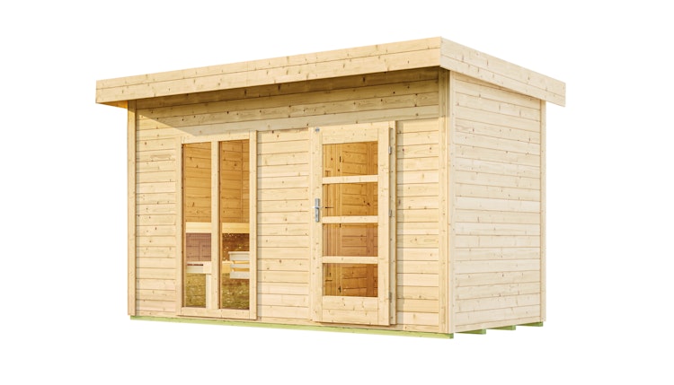 - Bitte denken Sie daran, den Fußboden mitzubestellen, falls dieser nicht im Standard-Lieferumfang enthalten ist. Bei Gartensaunen bleibt der Boden im Sauna-Raum unbehandelt.